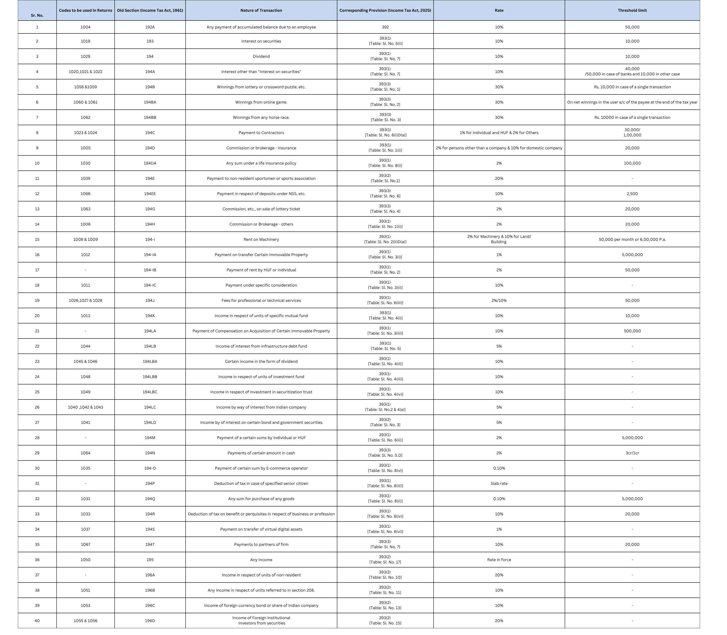 Old TDS Sections vs Amended TDS Sections under Income Tax Act, 2025